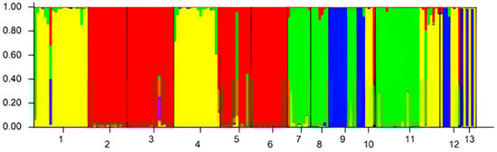 Figure 3. When K = 4, the grouping results of 13 populations are calculated by structure. Numbers 1 to 13, respectively, represent the QLFs, QLFxD, QLFxU, LuSs, LSxD, LSxU, MYSxU, MYSxD, MYSs, DWSx, Esx, LaoSs, and FHSs populations. The yellow, red, green, and blue sections represent groups A, B, C, and D, respectively.