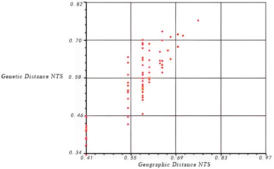 Figure 5. Mantel test between the genetic and geographic distance of P. serrulata populations. The red dots represent the relationship between genetic distance and geographic distance among cherry blossom samples.