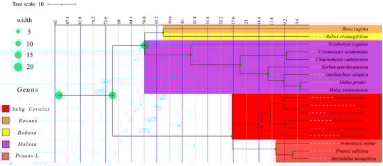 41. Zhang, S.D.; Jin, J.J.; Chen, S.Y.; Chase, M.W.; Soltis, D.E.; Li, H.T.; Yang, J.B.; Li, D.Z.; Yi, T.S. Diversification of Rosaceae since the late cretaceous based on plastid phylogenomics. New Phytol. 2017, 214, 1355–1367. [Google Scholar] [CrossRef]