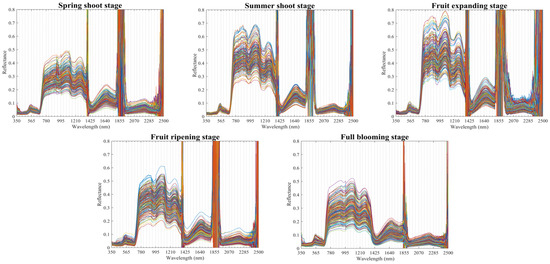 The canopy hyperspectral reflectance characteristics of individual Camellia oleifera trees during the five growth stages are shown in Figure 3. After excluding the anomalous wavelength bands affected by water vapor absorption across the full wavelength range, the spring shoot stage canopy reflectance values ranged between 0 and 0.492. In the 350–400 nm range, reflectance decreased as the wavelength increased, reaching the first reflectance peak in the 553–562 nm range. Starting at 560 nm, reflectance dropped, forming an absorption valley around 675–679 nm. From approximately 700 nm, the canopy reflectance increased, creating a steep rise known as the “red edge”, followed by a high reflectance plateau between 780 and 1000 nm, where the spectral reflectance remained stable. In the shortwave infrared region (1000–2500 nm), five wavelength ranges were affected by outdoor water vapor.