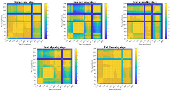 The Pearson correlation coefficient matrix for the canopy hyperspectral reflectance of Camellia oleifera in the 350–2500 nm range during the spring shoot stage, summer shoot stage, fruit expanding stage, fruit ripening stage, and full blooming stage is shown in Figure 4. As seen in the figure, the correlated regions with correlation coefficients greater than 0.8 are distributed along the diagonal, forming blocks of varying sizes corresponding to the ultraviolet, visible, near-infrared, and shortwave infrared spectral regions. In the other spectral regions, correlation coefficients are lower than 0.8, indicating a certain degree of independence between different bands.