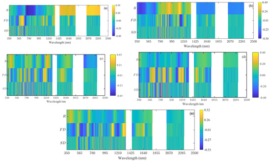 The Pearson correlation coefficient heatmap for LKC (Leaf Potassium Concentration) and canopy hyperspectral reflectance across the three preprocessing methods (R, FD, SD) during the spring shoot stage, summer shoot stage, fruit expanding stage, fruit ripening stage, and full blooming stage is shown in Figure 5.