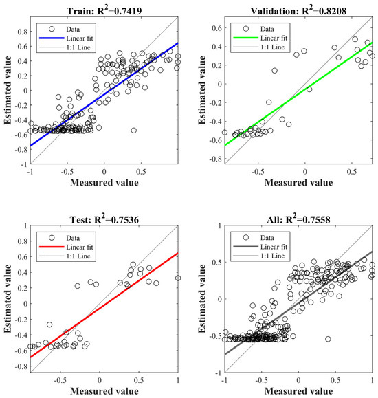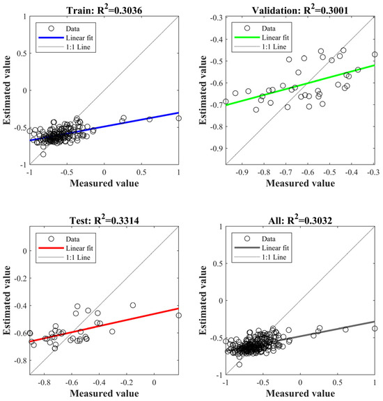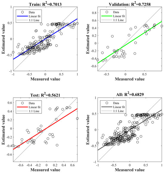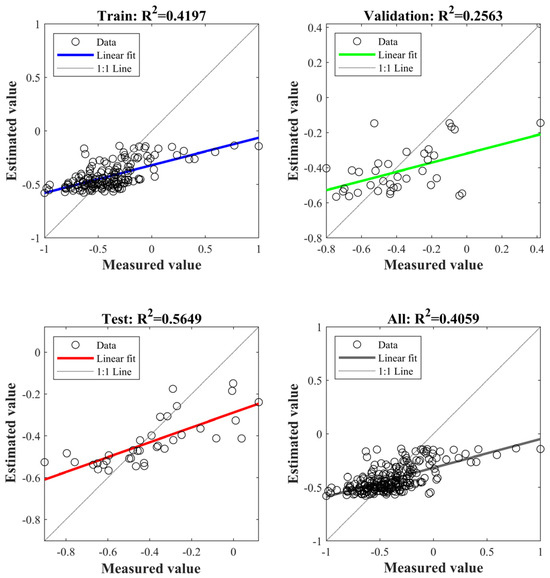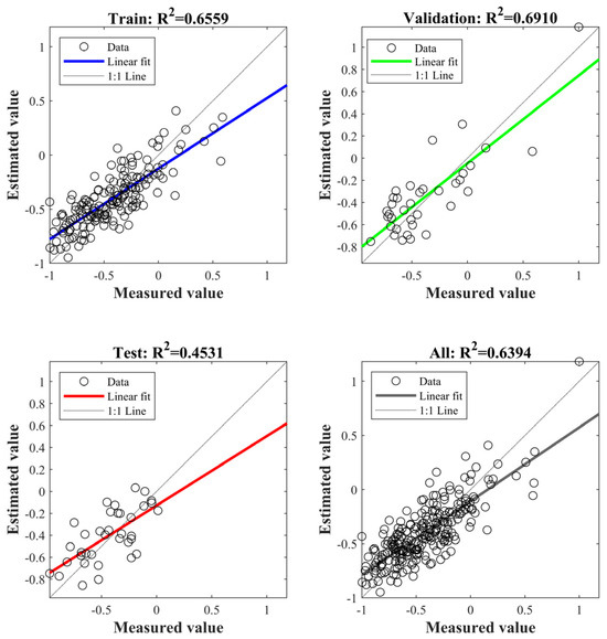 Figure 6 presents a scatter plot showing the relationship between the observed and estimated values for the corresponding dataset. To mitigate the negative impact of individual sample data on modeling, the LKC data were normalized before modeling. Since the neural network models were developed by directly utilizing MATLAB’s Neural Network Toolbox, the observed and estimated values in the scatter plots of the optimal models display the normalized data.