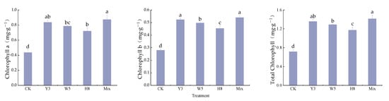 As illustrated in Figure 1, the photosynthetic pigment content of Parashorea chinensis seedlings significantly increased under all bacterial treatments compared to the control (CK) (p < 0.05). The Mix treatment exhibited the greatest impact, leading to significant increases in chlorophyll a (99.98%), chlorophyll b (92.86%), and total chlorophyll (95.83%) when compared to the CK (p < 0.05). This was followed closely by the Y3 treatment, with no significant difference with the Mix treatment. In contrast, the W5 and H8 treatments also enhanced photosynthetic pigment content, but the increases were comparatively lower than those observed in the Mix and Y3 treatments. However, no significant differences were found between the W5 and H8 treatments and the more effective treatments (p > 0.05).