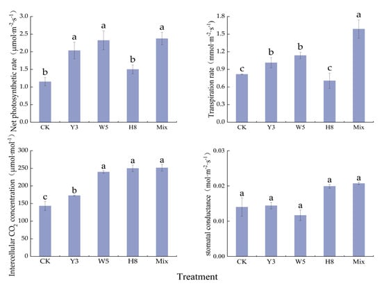 The photosynthetic characteristics of P. chinensis seedlings showed significant differences across various bacterial treatments, with the Mix treatment exhibiting superior performance (Figure 2). When compared to the CK treatment, the Mix treatment resulted in substantial increases in the net photosynthetic rate, transpiration rate, and intercellular CO2 concentration, with enhancements of 106.30%, 93.89%, and 75.51%, respectively (p < 0.05). Following the Mix treatment, the W5 and Y3 treatments showed considerable improvements as well. Specifically, net photosynthetic rates were elevated by 101.59% and 76.84%, while transpiration rates increased by 38.84% and 28.83%. Intercellular CO2 concentrations enhanced by 67.36% and 20.57%, respectively, when compared to CK (p < 0.05). In contrast, there were no significant differences observed between the H8 and CK treatments regarding the net photosynthetic rate, transpiration rate, and intercellular CO2 concentration (p > 0.05). Furthermore, stomatal conductance did not exhibit significant variation across any of the treatments (p > 0.05).