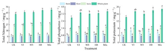 The nutrient contents in different organs of P. chinensis seedlings exhibited significant differences after various bacterial treatments (Figure 3). The total nitrogen content of the whole plant was significantly increased by 15.98%, 13.98%, 6.88%, and 7.06% compared to CK (p < 0.05), with the stem, root, and leaf nitrogen contents significantly higher than CK for all treatments, except the root under W5 treatment and the leaf under Y3 (p < 0.05). The total phosphorus content of the whole plant was highest under the Mix treatment, showing a significant increase of 25.54% compared to CK, while Y3, H8, and W5 treatments increased it by 20.86%, 18.35%, and 15.83%, respectively (p < 0.05). Only the root phosphorus content under the Mix treatment showed no significant difference compared to CK (p > 0.05), whereas other organs had significantly higher phosphorus content than CK (p < 0.05). The total potassium content of the whole plant under the Mix, H8, Y3, and W5 treatments was significantly increased by 32.12%, 26.30%, 12.55%, and 22.86%, respectively, compared to CK (p < 0.05). However, the root, stem, and leaf under the W5 treatment and the root under other bacterial treatments showed no significant difference compared to the corresponding CK (p > 0.05).
