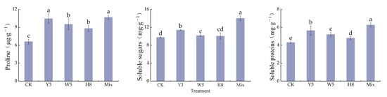 Significant differences were observed in the contents of proline, soluble sugar, and soluble protein in P. chinensis seedlings following various bacterial treatments, as depicted in Figure 4. All treatments, except for the soluble sugar content under the H8 treatment, resulted in significantly higher levels compared to the CK treatment. Among the treatments, the Mix treatment exhibited the most pronounced effects, with proline, soluble sugar, and soluble protein contents increasing by 61.41%, 43.86%, and 45.48%, respectively, compared to CK (p < 0.05). The Y3 treatment also showed notable increases, with proline, soluble sugar, and soluble protein contents rising by 57.99%, 16.73%, and 30.98%, respectively (p < 0.05). In the W5 treatment, proline, soluble sugar, and soluble protein contents increased by 43.91%, 4.24%, and 20.78%, respectively, compared to CK (p < 0.05). The H8 treatment led to significant increases in proline and soluble protein contents by 33.24% and 11.37%, respectively, compared to CK (p < 0.05), while no significant difference was observed in soluble sugar content between H8 and CK treatment (p > 0.05).