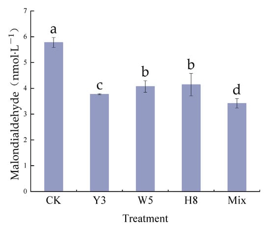 The malondialdehyde (MDA) content of P. chinensis seedlings is shown in Figure 5. The Mix treatment resulted in the lowest MDA content, with a significant reduction of 40.83% compared to CK (p < 0.05). Similarly, the Y3 treatment significantly decreased MDA content by 34.70% compared to CK (p < 0.05). In the W5 and H8 treatments, MDA content was also significantly reduced by 29.56% and 28.33%, respectively, relative to CK (p < 0.05).