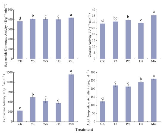 As illustrated in Figure 6, the different bacterial treatments had significant effects on enzyme activities in P. chinensis seedlings, generally exhibiting higher activity levels compared to the CK treatment. Under the Mix treatment, the activities of SOD, POD, CAT, and acid phosphatase activities were the highest, showing significant increases of 9.83%, 292.32%, 23.66%, and 111.88%, respectively, relative to CK (p < 0.05). The Y3 treatment also significantly increased SOD, POD, and CAT activities by 6.88%, 134.37%, and 5.80%, respectively, compared to CK (p < 0.05). Similarly, the W5 treatment resulted in significant increases in SOD, POD, and CAT activities by 5.74%, 90.20%, and 10.18%, respectively, relative to CK (p < 0.05). The H8 treatment significantly elevated SOD, POD, and CAT activities by 5.23%, 66.57%, and 1.73%, respectively, compared to CK (p < 0.05), and its acid phosphatase activity was significantly enhanced by 95.42% compared to CK (p < 0.05).