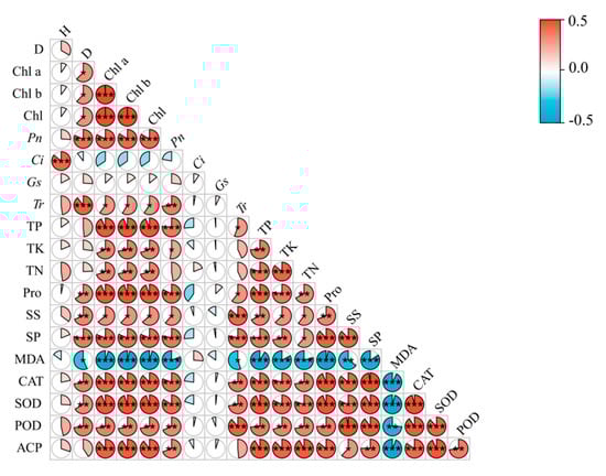 Correlation analysis between growth and physiological parameters of Parashorea chinensis seedlings. Note: H: height growth; D: diameter growth; Chl: total chlorophyll; Pn: net photosynthetic rate; Ci: intercellular CO2 concentration; Gs: stomatal conductance; Tr: transpiration rate; TP: total phosphorus; TK: total potassium; TN: total nitrogen; Pro: proline; SS: soluble sugar; SP: soluble protein; MDA: malondialdehyde; CAT: catalase activity; SOD: superoxide dismutase activity; POD: peroxidase activity; ACP: acid phosphatase. * p < 0.05; ** p < 0.01; *** p < 0.001.