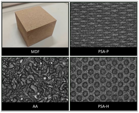 Experimental materials. MDF, medium-density fiberboard; AA, accumulated abrasive belt; PSA, precision-shaped abrasive belt; PSA-H, hemispherical abrasive particle PSA; PSA-P, prismatic abrasive particle PSA.