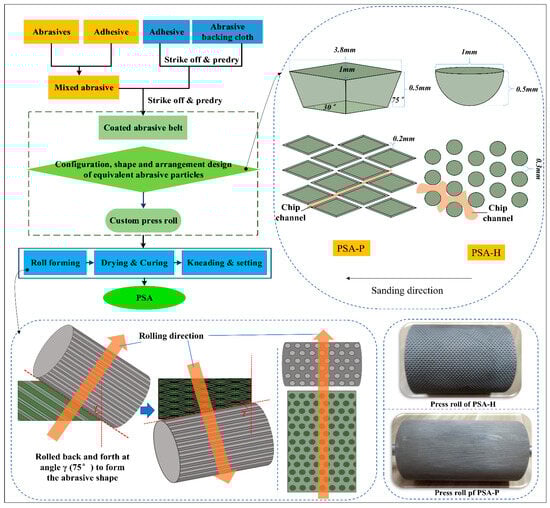 A pyramidal PSA at a 30° angle achieves better results in material removal, surface quality, and chip removal [], and a spherical abrasive has higher material removal rates and less material buildup compared to a conical abrasive []. Therefore, a 30° prismatic abrasive particle PSA (PSA-P) and a hemispherical abrasive particle PSA (PSA-H) were chosen for this study. The production process and method of PSAs are shown in Figure 2.