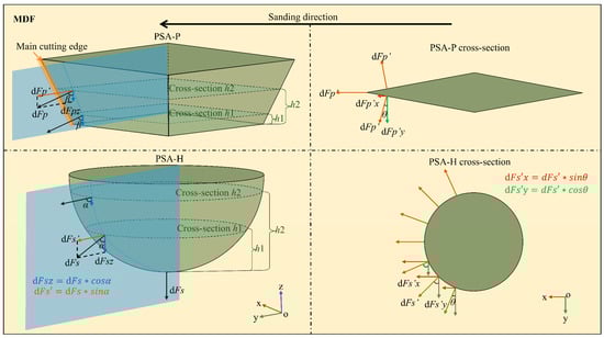 As shown in Figure 3, according to the morphological and force analysis of the PSAs particles, dFpz and dFsz squeeze the MDF downward, while dFp and dFs squeeze the MDF outward. Angles β and θ remain constant across different cross-sections, ensuring that the stability of the PSA-P force will facilitate the removal of stable materials in theory. The angle α of PSA-H increases with the cross-section increment, leading to an amplified extrusion force on MDF. As the cutting direction progresses, the angle θ between the force and the y-axis enlarges, resulting in a gradual increase in dFs′x and developing a stress concentration area at the leading edge of particles, which can promote material removal in theory.