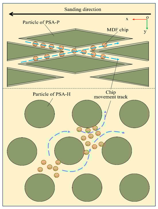 Through the investigation of an abrasive belt factory, it was discovered that the normal mechanical wear of abrasive belts was only 5%, and more than half of the premature failures were actually caused by blockages, as shown in Figure 4b. In light of this finding, a PSA with regularly arranged large abrasive particles composed of multiple micro-abrasive particles was designed, as shown in Figure 5. The chip removal space of PSA-P appears linear, PSA-H is curved, they are all regular and continuous, and they can offer excellent chip removal performance and avoid blockages in theory, which differ distinctly from the conventional abrasive belt (CA) used in MDF as shown in Figure 4a.