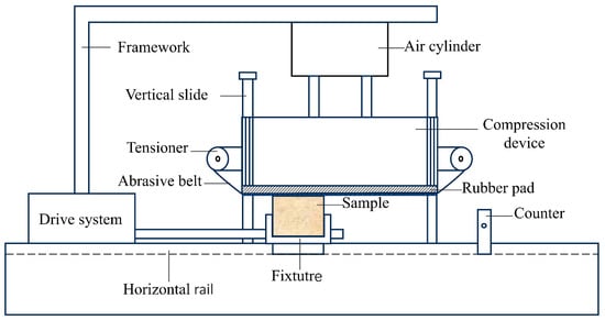 The sanding test equipment was designed and fabricated as shown in Figure 6. MDF samples were attached to the fixtures. The drive system provides a fixed trajectory linear reciprocating motion (0.3 m/s) for sanding. The abrasive belt is fastened to the compression device using a tension wheel, and a rubber pad is arranged in the middle to give the belt a better fit. The air cylinder provides a constant sanding pressure and moves straight on the vertical slide (the cylinder lifts up when the sample returns for one-way sanding), while moving downward as the thickness of the sample decreases, to ensure continuous contact between the abrasive belt and the sample when cylinder pressed down. A photoelectric counter is provided to record the number of sanding times; when reciprocated once, the count adds one.