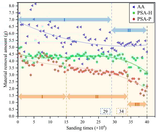 PSAs exhibit a homogeneous particle arrangement with excellent uniformity of height and size distributions, lead to a more stable material removal than the AA. The particles are not as sharp as those of the AA, experiencing less re-sanding of taller particles covering shorter and smaller particles, resulting in less material removal than in the AA. In stage I, the abrasive profile of the PSAs is relatively sharp and gradually wears down during sanding, leading to a high but diminishing initial material removal. Due to the uneven heights of individual particles, the material removal is relatively dispersed. In stage II, the height uniformity of the particles is optimal, exhibiting symmetric contours and numerous small, sharp edges, which perform stable sanding, resulting in consistent material removal. In stage III, particles become shorter, the surface area becomes larger, and the depth of pressing into MDF gradually becomes shallower, resulting in a linear decline in the material removal, and the removal amount becomes unstable due to the pits on the surface of the particles because of wear.