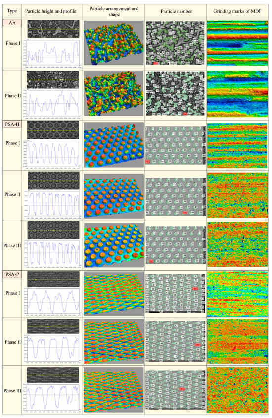 To explore the reasons for these findings, this study observed and analyzed the height, profile, arrangement, number, size of abrasive particles, and surface sanding marks of sanded MDF. This is illustrated in Figure 8.