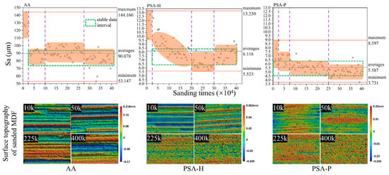 The results show that the Sa of the MDF sanded with three kinds of abrasive belts is relatively large and fluctuates when it ranges from 0 to 25,000 times. Since the particles in the initial phase are sharp and have a small surface area, this leads to a high cut depth and leads to a large Sa of the MDF. Furthermore, due to the irregular height of particles, the effective number of particles changes with wear, resulting in an unstable Sa of MDF, as depicted in Figure 10a. Then, the Sa of the MDF sanded with AA decreases and fluctuates primarily ranging from 75 μm to 95 μm, as the uniformity height of the worn particles gradually improves. However, marks on the MDF surface undergo changes due to the inhomogeneous distribution, size, and shape of particles, as illustrated in Figure 10b, and the Sa of the MDF still remains large and subject to fluctuations. The Sa of the MDF surface fluctuates and decreases linearly when sanded by PSA-H; as the particles transition from sharp to flat, the cut depth becomes shallower and the indentations left on the MDF surface shift from curved to planar, as depicted in Figure 10c. Moreover, the gaps between flattened particles decrease, resulting in weak changes in the scratches on the MDF surface, as illustrated in Figure 10d. As a result, the Sa of the MDF become slightly stable at 200,000 times. Later, as the particles on the PSA-H surface fall off, a few dents develop, leading to the Sa of the MDF beginning to rise and fluctuate within a certain range at 300,000 times, as shown in Figure 10e, mainly distributed in the range of 6.5–8.5 μm. After the sanding of PSA-P, the Sa of the MDF decreases slowly and fluctuates steadily distributed in 4.5–6.5 μm range, and the surface of the flat particles gradually enlarge with wear, leading to shallower cutting depths, and a reduction in particles gap. Additionally, the marks left by particles gaps in the front row on the MDF surface are smoothed by particles in the back row, as depicted in Figure 10f, resulting in a stable and gradually decrease in the Sa of the MDF. PSA-P demonstrates the most stable sanding performance, as evidenced by the mean deviation and range of the MDF Sa after sanding.