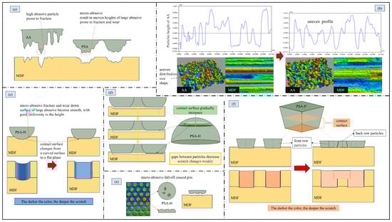 Demonstration of particle and MDF profile during sanding: (a) condition of abrasive particles in the initial stage; abrasive particles and MDF surface mark changes in AA (b), PSA-H (c), and PSA-P (f) during sanding, and that of PSA-H (d) in stage II and (e) in stage III. AA, accumulated abrasive belt; PSA, precision-shaped abrasive belt; PSA-H, hemispherical abrasive particle PSA; PSA-P, prismatic abrasive particle PSA.