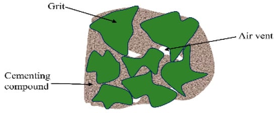 The large abrasive particles of PSA consist of many small abrasive particles and have the same pore structure, as shown in Figure 11. During the sanding process, PSA experiences similar failure modes as traditional abrasive belts, including wear and fall-off []. In addition, PSA also experiences large particle wear, and the clumps of abrasive particles fall off. The wear mechanism of PSA is more complicated.