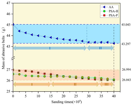 From the mass changes in abrasive belts depicted in Figure 12, a continuous decline in mass is evident that abrasive belts undergo continuous wear. In stage I, AA experiences a significant mass loss, while PSAs exhibit a stable decline in mass. Stage II exhibits a linear, steady decline or minimal variation, indicating stable wear. The mass change in stage III is minimal. And the mass loss of the PSA is more than 1.8 times lower than that of the AA, indicating that the wear pattern experienced by the PSA is more stable.