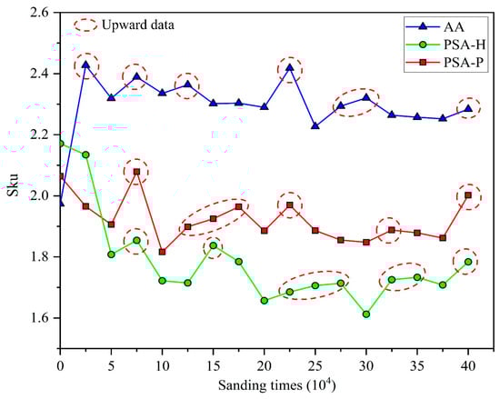 The decrease in Sku indicates that the sharpness of abrasive belt surface diminishes, and more wear occurs; conversely, an increase in Sku signifies that the sharpness of the abrasive belt surface enlarges, and particles break or fall off, exposing sharp cut edges, a phenomenon called self-sharpening (high and sharp abrasive particles are more prone to this phenomenon), observed in all three abrasive belts, as shown in Figure 13. A consistent rise in Sku indicates that the abrasive belt demonstrates stable self-sharpening, enabling it to consistently deliver effective sanding. The particle height in the PSA is about three times lower than that of the AA, but the same or higher level of self-sharpening occurs.