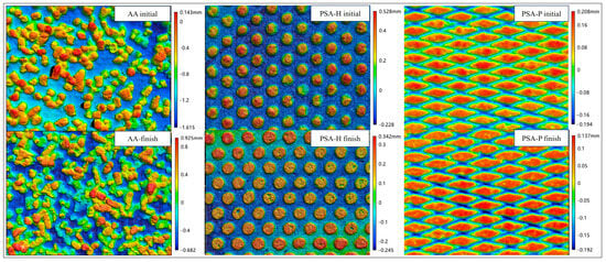 As can be seen from the surface topography of the abrasive belts before and after sanding in Figure 14, the wear of the PSA is more obvious and the surface is uniform in red, indicating that the height uniformity of large wear particles becomes stronger. However, pits appear on the surface of the PSA after sanding, indicating that there are clusters of micro-particles falling off. The height uniformity of the AA changes little, and there are many shot particles not involved in sanding.