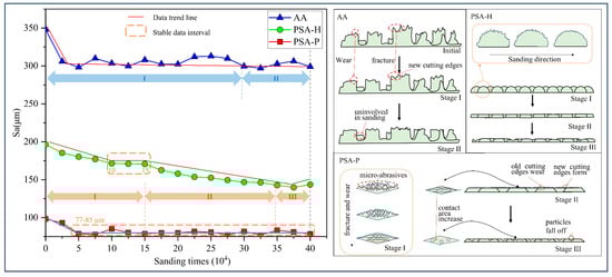 PSAs reach stage II when sanded 15,000 times, and reach the last stage at 34,000 times. Stage I of the AA is almost twice as long as that of PSAs, and reaches the stable stage II when sanded 29,000 times, not yet reaching stage III. Combined with the data in Table 2, it is found that the mean deviation (MD) of material removal by AA was 2.0 and 1.34 times higher than that of PSA, with a poor stability and large rate of decline. And the MD of the SiC PSA is lower than that of the brown corundum PSA [], demonstrating that the SiC PSA can provide a more stable material removal effect and PSA-H is better. The average material removal of AA is 1.48 times higher than PSA, which is consistent with the theoretical analysis. But according to the above analysis of particle height and contact area, their dominance does not significantly improve material removal.