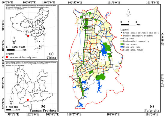 Pu’er City is the first national-level green economy pilot demonstration zone in China and was named a “National Garden City” in 2013. Considering the size, economic development status, and population of the city, Pu’er City is selected as a representative of small- and medium-sized cities and chosen as a case study. The scope of this study is consistent with the urban-planning area of Pu’er City, located in the central part of Simao District, Pu’er City, Yunnan Province. It is the area with the largest urban population and the highest level of urbanization in Pu’er City. According to the 2020 China Population Census Yearbook, by the end of 2020, the urban population in the urban-planning area was 289,662, with a total of 24,365 families, and the urbanization level was nearly 69.6%. The planning area was about 65.87 km2, and the built-up area was 26.5 km2. There were 34 recreational green spaces in the study area, with a total area of 4.28 km2.