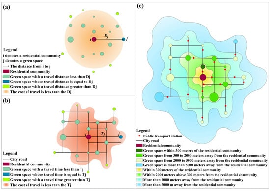 The real travel cost of residents is an important basis for calculating the interaction intensity of recreational green spaces. Travel cost is generally measured by travel distance, travel time [56], and the cost incurred by the travel [57]. However, short-distance trips by intra-city residents have significantly different travel modes compared to long-distance, inter-city trips. While long-distance, inter-city trips are typically made via automobile and other modes of transportation, short-distance trips by intra-city residents consist of walking, automobile trips, and public transportation trips. This is coupled with individual economic differences among residents, the insensitivity of some residents to the costs incurred for traveling, and the costs not directly incurred by residents walking. In summary, it was found that factors such as the urban transportation network, the distribution of public transportation stops, and the mode of travel must be taken into account when using geographic distance and time to measure the cost of residents’ trips to recreational green spaces [58] because trips need to pass through the urban transportation network regardless of the mode of travel, and the cost of trips cannot be measured simply by calculating the geographic distance between the residential area and the recreational green space [59], as shown in Figure 2a,b. In addition, because the distance of travel has a great influence on the mode that residents choose to travel [20], this study calculates and grades the distance between residential areas and all recreational green spaces based on the urban public transportation network and determines the travel modes that residents may use based on the distance, as shown in Figure 2c.
