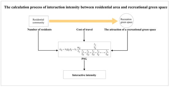 The calculation process of interaction intensity between residential area and recreational green space.