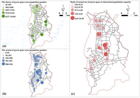 The theory of green space uses population number classification graphs (a). The actual green-space-use population number classification graphs (b). The classification graphs of the ratio of actual use of green spaces to theoretical population capacity (c).