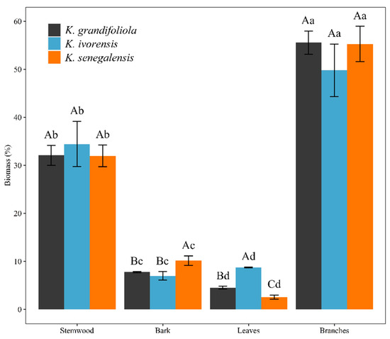 Significant variations in the percentages of each biomass component are observed in Figure 2. The compartments of bark and leaves show differences between species (p < 0.05). K. senegalensis exhibited the highest percentages of bark, with an average of 10.16%, followed by the other species, with approximately 7%. On the other hand, K. ivorensis stood out for its higher percentage of leaves, being superior to K. grandifoliola and K. senegalensis by 48% and 70%, respectively. The branches did not vary by species, reaching an average of 53.55%, the highest among the components. No differences were observed for the stems, which averaged 32.85%.