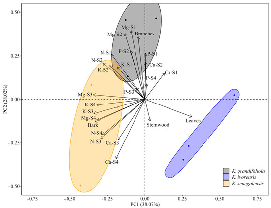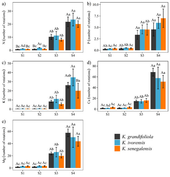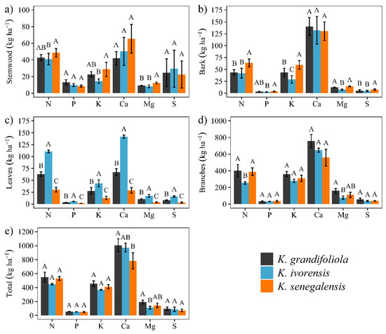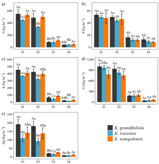 Nutrient stocks per hectare in different compartments are observed in Figure 3. In the stem compartment, it is noted that the stocks of P, Ca and S were not influenced by the species. In contrast, K. senegalensis and K. grandifoliola showed the highest stocks of N and K (45.72 and 25.63 kg ha−1, respectively), followed by K. ivorensis (41.07 and 14.54 kg ha−1). The species K. senegalensis also exhibited superior Mg stocks for the stem, presenting approximately 26% and 33% more than K. grandifoliola and K. ivorensis, respectively.