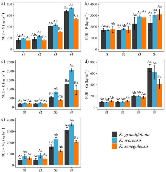 Similar to eucalyptus cultivation, the majority of Khaya spp. plantations are built in areas with naturally low levels of soil fertility and water availability, requiring a high NUE [17,18]. This parameter links biomass production with physiological parameters, including nutrient absorption, assimilation, translocation and storage. This index also assists in selecting the species best adapted to local conditions, serving as a selection criterion alongside quality and productivity parameters [19].