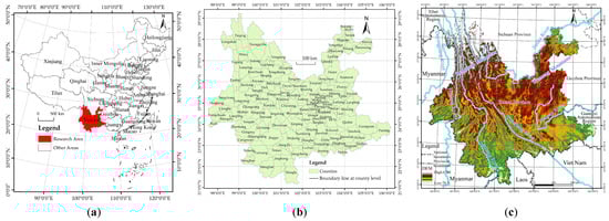 Yunnan Province is located in the southwestern border area of China, situated between longitude 97°31′39″ E–106°11′47″ E and latitude 21°8′32″ N–29°15′8″ N (Figure 1). At the end of 2020, there were 16 prefectures and 129 counties, and the total population was 47.22 million, of which 15.64 million (33.12%) were ethnic minorities [37]. In 2020, the GDP of Yunnan was CNY 2.45 trillion, of which the output values of the primary, secondary, and tertiary industries were CNY 359.89 billion (14.68%), CNY 828.75 billion (33.80%), and CNY 1.26 trillion (51.53%), respectively. In 2020, the per capita disposable income (PCDI) of all residents was CNY 23,295, and the PCDI of rural residents was CNY 12,842, both ranking 28th in China (i.e., fourth from the bottom) [38].