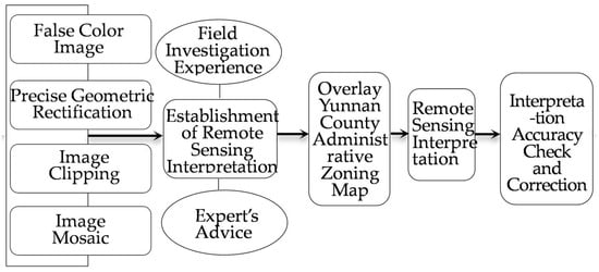 Due to the fact that the land use changes caused by the PRFF in mountainous areas are often concentrated and contiguous, the spatial scale of the plots of returning farmland to forest (RFF) is mostly large, while small-scale plots of RFF not only have a small number, but also have a small plot area. Therefore, they have less significant impact on the final measurement results of land use changes in mountainous areas, and can even be almost ignored. In terms of seasonality, this study selected images with winter cloud cover of less than 10% for interpretation. This study selected RS image data in winter for interpretation to take into account weather conditions such as cloud cover and precipitation. Generally speaking, Yunnan experiences less precipitation in winter, and RS images have lower cloud cover, which facilitates the interpretation of various types of land. Additionally, it considers the impact of vegetation growth stages and seasonal changes on the spectral characteristics and appearance of land features. At the same time, consistency is also required in the time selection of RS image data from each period in order to analyze LUCC more accurately. The seven periods of the land use vector database of Yunnan were obtained by using the LULC type of the 7 periods of RS image interpretation through human–machine interaction.