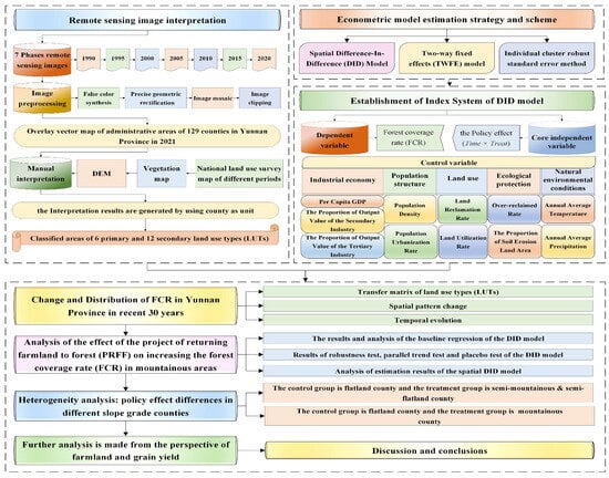 Overall, the research steps of this study mainly include the following: interpreting 7 periods of RS images and obtaining LULC data by ENVI 5.3 software and ArcMap 10.5 software; constructing the indicator system; selecting suitable policy evaluation tools, such as the DID model and the spatial DID model, to estimate the policy effect of PRFF on improving the FCRs in non-flatland counties by Stata 15.1 software; carrying out routine tests of econometrics by Stata 15.1 software; and discussing the results and drawing conclusions.