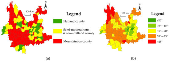 The 129 counties in Yunnan Province. (a) The county-level classification results with different slopes; (b) the average slope of the 129 counties in Yunnan Province.