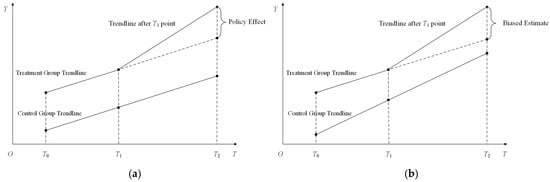 Principle diagram for evaluating policy effect. (a) The situation where the parallel trend assumption before policy implementation is met; (b) the situation where the parallel trend assumption before policy implementation is not met.