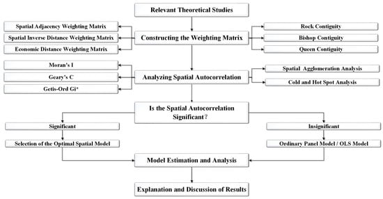 As the data in this study involve 129 counties in Yunnan, there may be significant spatial autocorrelation issues in data analysis, so it may be necessary to use spatial econometric models [25]. The reason why spatial autocorrelation data is suitable for estimation by using spatial econometric model is that these sample observations will change with spatial changes (generally higher in high–value areas and lower in low–value areas, and the dependent variable is significantly affected by spatial location). Traditional estimation methods cannot effectively control the interference of spatial clustering characteristics on the estimation results. Therefore, in Formulas (1) and (2), these spatial effects can only be explained by random disturbance terms, which will may cause deviation from the estimation results of the DID model, although the DID model has already considered fixed effects of individuals and times. The main steps in establishing spatial econometric methods are clearly illustrated in Figure 6.