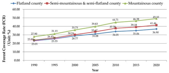 It can be seen that the FCRs of various counties have significantly improved in the past 30 years, especially for the eastern part of Yunnan, which has a relatively fragile ecological environment. The achievement is also due to Yunnan’s emphasis on ecological protection and the efforts of extensive-scale afforestation. In addition, this study, by combining and comparing the classification results in Figure 4, finds that the FCRs in Yunnan generally show a pattern of higher in mountainous areas and lower in flat counties, as well as a trend of lower in the east and higher in the west. Therefore, it is reasonable to classify the 129 counties into three types.