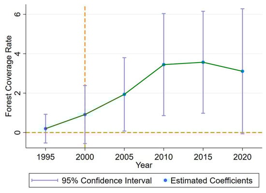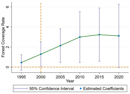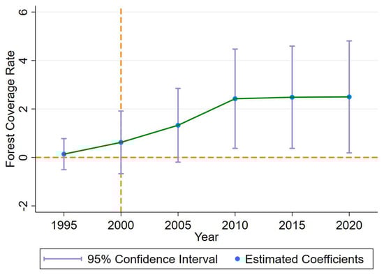 In terms of selecting essential variables, the dependent variable used in this study is the panel data of the FCRs of 129 counties in 7 periods obtained through RS image interpretation, and the core independent variable is the interaction term (Time × Treat). However, selecting appropriate control variables and constructing a reasonable indicator system for the control variables is still an essential step. It should be noted that the TWFE model can better control all other disturbances that do not change with time (such as terrain and slope) and the same impact of disturbances in each year (such as COVID–19, unified price changes and government policies promoting afforestation). Therefore, when selecting control variables, only the influencing factors closely related to the FCR and change with time and individuals need to be considered.