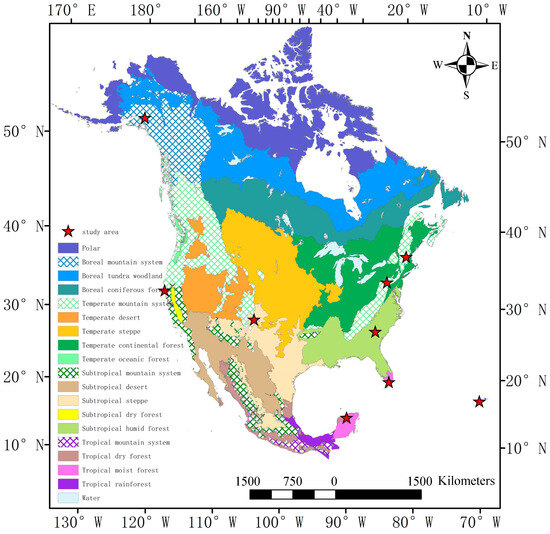 Due to the high cost and time required for on-site data collection, we used open-source and high-precision airborne LiDAR G-LiHT (Goddard’s LiDAR, Hyperspectral, and Thermal Imager) data as validation data. The study was conducted at nine G-LiHT sites in North America. The study areas were Alaska (USA), Florida (USA), South Carolina (USA), New Hampshire (USA), Colorado (USA), Pennsylvania (USA), California (USA), Puerto Rico (USA), and Yucatán (Mexico), as shown in Figure 1. The research area covers cold zones, temperate zones, and tropical zones. The focal species were Metasequoia glyptostroboides, Quercus margarietta, Pinus taeda, Podocarpus imbricatus, Larix gmelinii, Sequoia sempervirens, Sequoia endron giganteum et al. The range of tree heights was 1.2 m–57 m. The elevation range of the understory terrain was 0 m–2537 m. The terrain of the research areas included flat land, hills, and mountains. Details of the study areas are shown in Table 1.