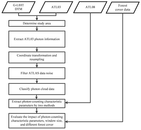In the equations, “zi” represents the CHM provided by ATLAS, “hi” represents the CHM value of the G-LiHT data, “n” represents the number of study data points, and represents the average value of G-LiHT data. Figure 3 shows the technical route of our study.