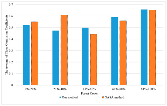 As shown by the accuracy indicators of the two algorithms for different forest cover percentages presented in Table 4, their best correlation coefficient performance was under a forest cover range of 81% to 100%. For this range, the proposed algorithm achieved an R2 of 0.61, and an average of the three correlation coefficients of 0.66. The NASA algorithm achieved an R2 of 0.60, and an average of the three correlation coefficients of 0.65. However, it is noteworthy that in this range of forest coverage, the RMSE and MAE metrics indicate subpar performance. Upon investigation, we realized that the high RMSE and MAE could be attributed to the generally higher canopy heights in areas with a forest cover range of 81% to 100%. In the study areas with forest cover of 81%–100%, the overall canopy height tends to be higher compared to lower coverage areas. Higher canopy heights may lead to more variability and complexity in the estimation process, leading to larger overall errors. This increase in canopy height leads to an increase in the RMSE and MAE when estimating the results. Comparing the accuracy of the two algorithms in estimating canopy height, it can be concluded that, except for the forest cover range of 21% to 40%, the proposed algorithm consistently outperformed the NASA algorithm.
