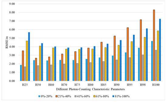 RMSEs of different photon-counting characteristic parameters under different forest cover conditions, achieved with this study’s algorithm.
