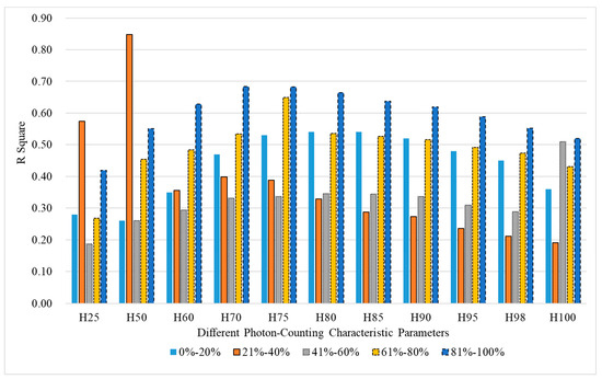 R2 of different photon-counting characteristic parameters under different forest cover conditions, achieved with this study’s algorithm.