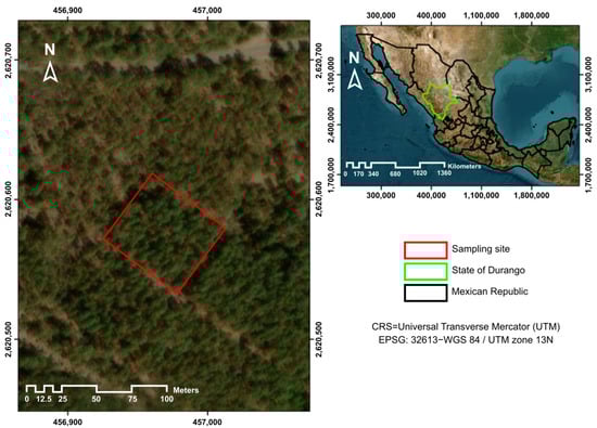 The study in Mexico was conducted in a permanent forest research plot, established following the methodology of Corral-Rivas et al. [18], with a quadrangular area of 625 m². This site is located in the Sierra Madre Occidental region, within the “La Victoria” management unit, in the municipality of Pueblo Nuevo, Durango, Mexico. The climate is temperate, with an average annual temperature ranging from 20 to 22 °C, and average annual precipitation between 800 and 1200 mm. The predominant vegetation consists of a coniferous forest, primarily composed of Pinus cooperi C.E. Blanco, with a tree density of 960 trees per hectare (Figure 1).