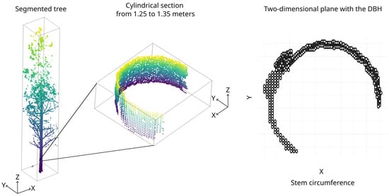 Subsequently, all trees, including those scanned on-site and those obtained from referenced databases, were processed. For each stem, a cylindrical section was isolated by selecting points with a z-coordinate between 1.25 m and 1.35 m, discarding those that did not meet this criterion. This approach allowed for the extraction of a trunk segment corresponding to the DBH.